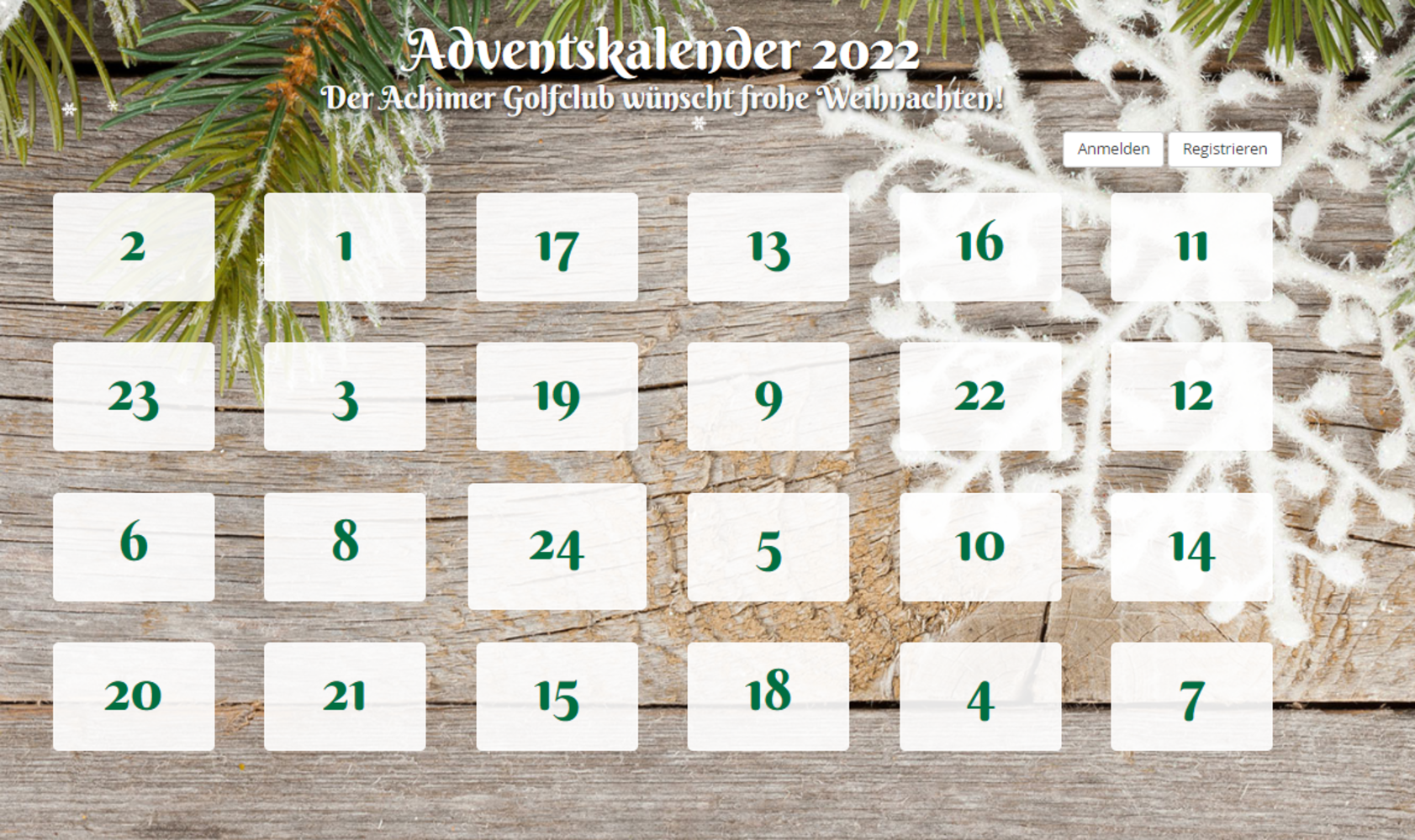 Zusätzlich zu den täglichen Preisen verlosen wir unter allen Teilnehmer:innen, die bis dahin noch nichts gewonnen haben, am 25. Dezember insgesamt drei Preise für drei Personen. Ihr könnt Euch in der Auslosung auf eine Überraschungstüte aus Brünings Scheune, Ballguthaben für die Range oder einen Greenfee-Gutschein für unsere 18-Loch Anlage freuen.