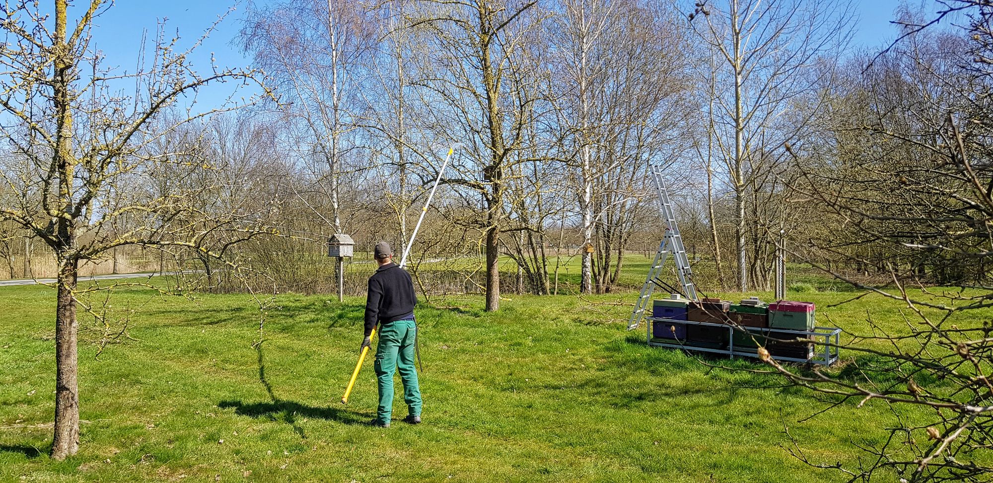 Unsere 93 Obstbäume bedürfen einer regelmäßigen Pflege. Schließlich wollen wir einen schönen und ertragreichen Bestand haben. Michael Ruhnau ist Vorsitzender des Pomologenverbandes in Niedersachsen und hat zusammen mit seinem Kollegen unsere Bäume professionell beschnitten.