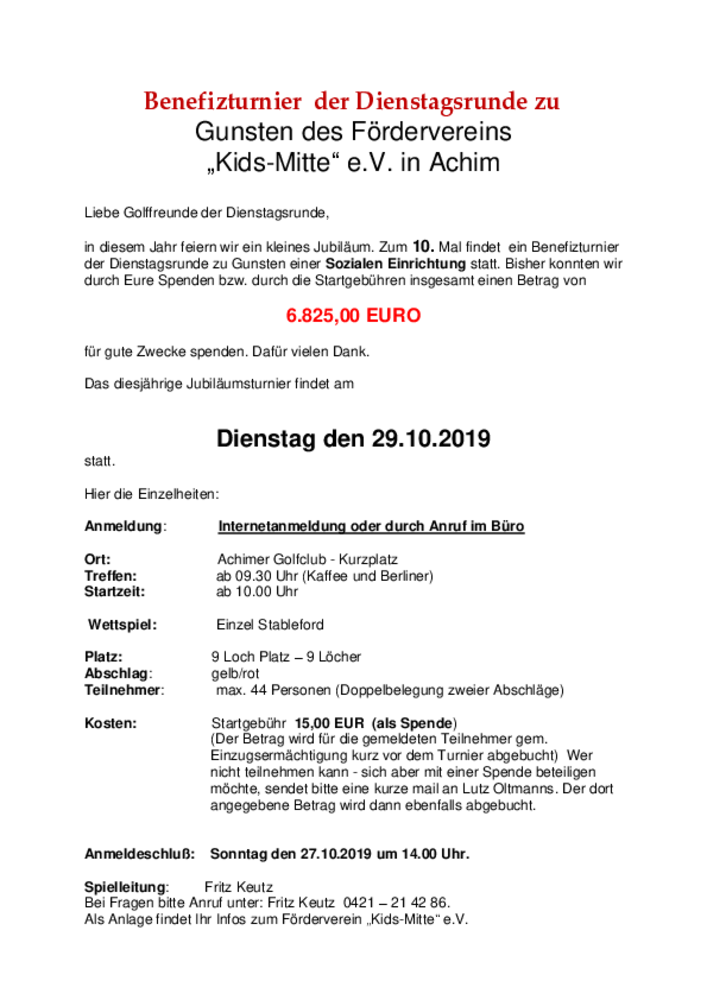 Wie auch in den vergangenen Jahren möchten wir gemeinsam für einen guten Zweck Golf spielen. In diesem Jahr soll der Erlös dem Förderverein "Kids Mitte" e.V. in Achim zu Gute kommen.