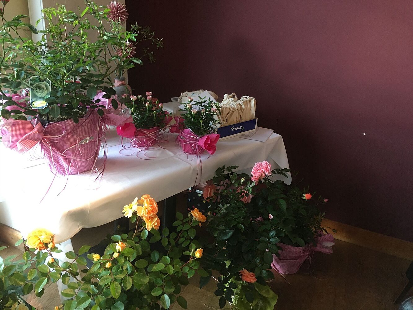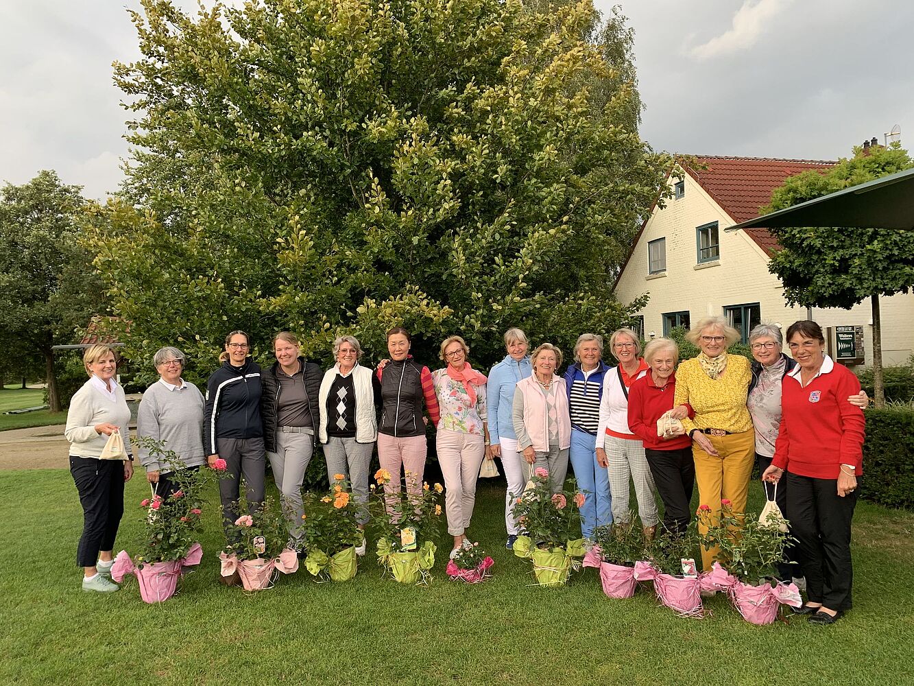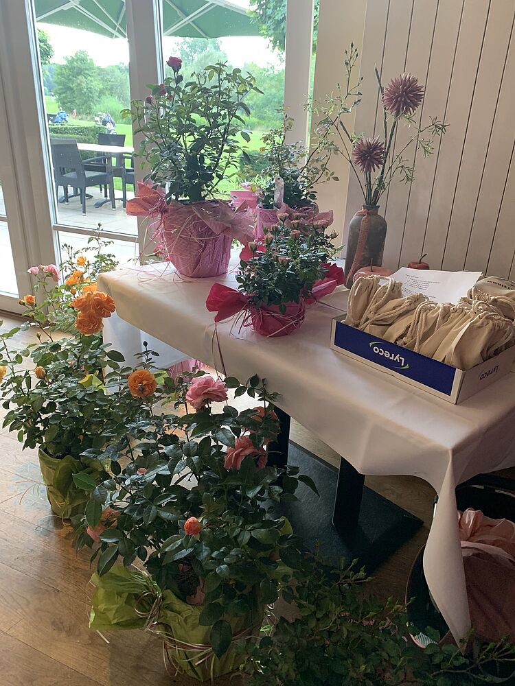 Nachdem das Wetter ziemlich regnerisch, bewölkt und zumindest wechselhaft angesagt war, haben alle Spielerinnen über den Tag nur einen großen Schauer abbekommen und konnten am Tagesende sogar bei etwas Sonnenschein das Siegerfoto machen. An dieser Stelle ein herzliches Dankeschön an Helmut Kempf, der mit seinem Autohaus Kempf wie auch in den Vorjahren die schönen Rosen gesponsert hat.