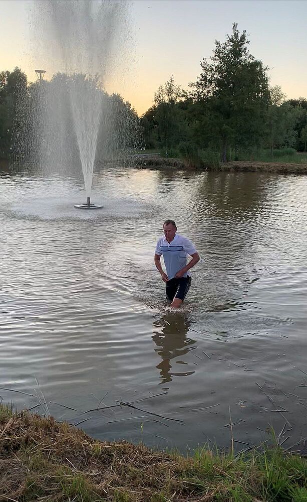 Unser neuer Singlehandicaper Arno Kloos musste danach natürlich der Tradition entsprechend in den Teich. Arno hat das unter dem Beifall der Herrengolfer sichtlich genossen und hat die Taufe gut überstanden. Gratulation Arno, auch im Wasser hast Du eine gute Figur gemacht.
