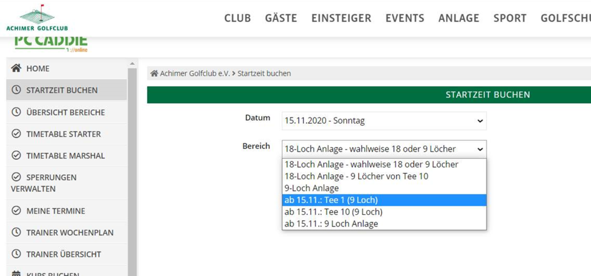 Im Online-Startzeitensystem könnt Ihr Eure Startzeit bis Samstag, den 14.11. wie gewohnt über die Auswahl der oberen drei Plätze buchen. Ab Sonntag, den 15.11. müsst Ihr Eure Startzeiten über die Plätze mit dem Eintrag "ab 15.11." buchen.