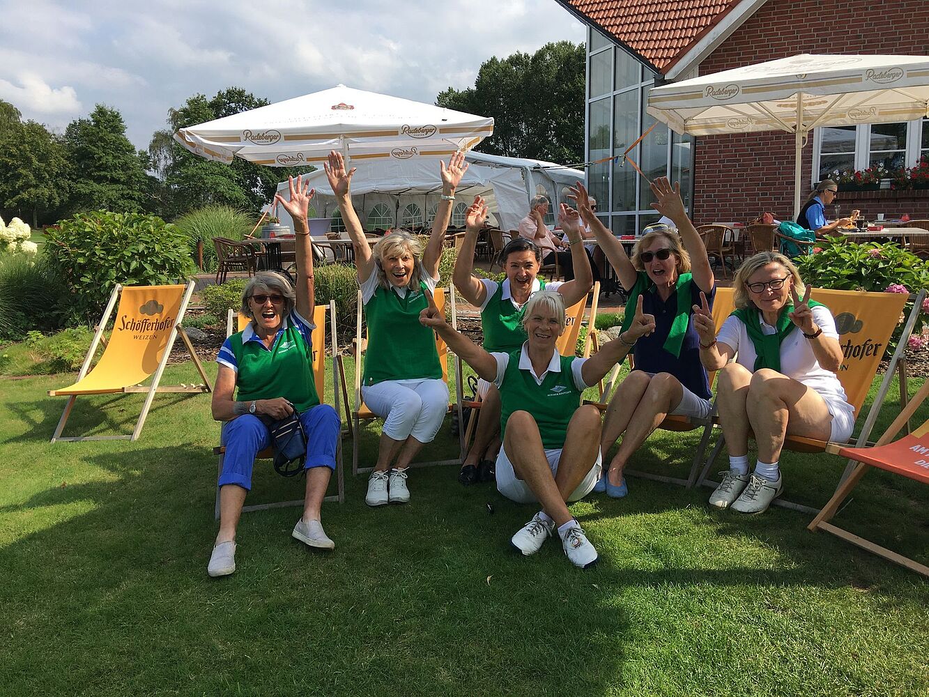 Für uns Achimer Damen ging es nicht um den Klassenerhalt, der war uns sicher und wir wagten den Gedanken an einen Aufstieg. Nachdem fünf Flights im Clubhaus angekommen waren stand es für Hude und Achim 2,5:2,5. Die Spannung war kaum auszuhalten, und wir waren alle ums 18. Grün versammelt. Hella Paschkowski und Barbara Klute spielten ihren letzten Ball aufs Grün. Bei Hella ging nach dem letzten Putt der Daumen hoch, danach war für Achim kein Halten mehr. Die Damen waren außer Rand und Band. Achim steigt auf in die Liga-Gruppe 2.