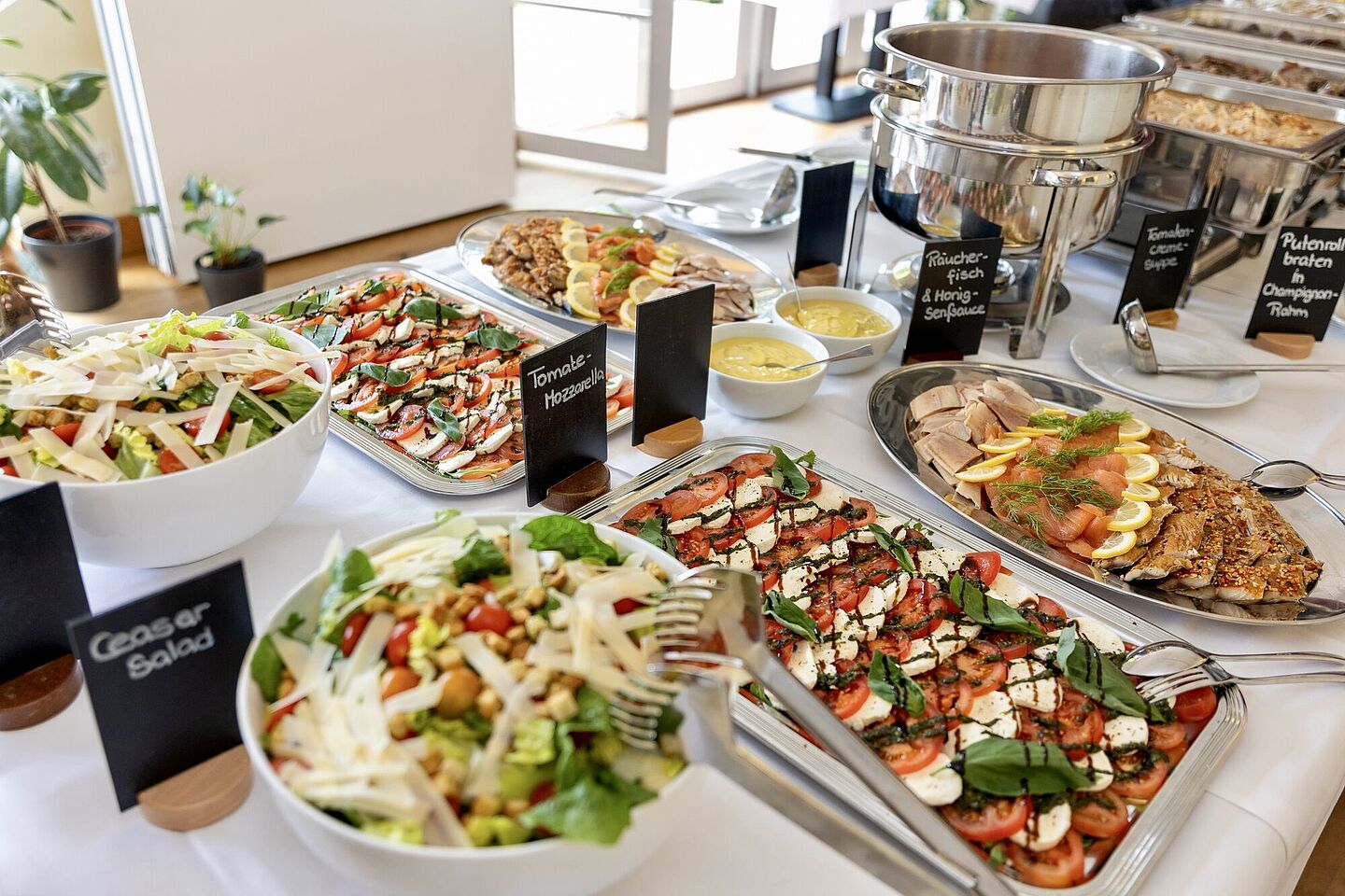 Veranstaltungen werden mit individuell abgestimmten Speisen und Getränken geplant. Auch bei der Raumgestaltung, Tischdekoration oder der Präsentation von Bannern, Flags oder Tafeln steht das Team unterstützend zur Seite. Eine Mikrofonanlage sorgt zudem für klare Ansprache aller Gäste.