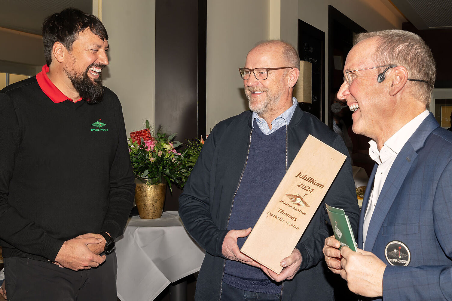 Der Neujahrsempfang bot auch Gelegenheit für die Ehrung von Mitarbeitern: Rebecca Horneburg wurde für ihr 15-jähriges Engagement und Thomas Schmidt für 10 Jahre als Clubmanager geehrt. Die Übergabe der Präsente durch die Werder Bremen-Legenden Rigobert Gruber und Thomas Schaaf war für alle Gäste eine große Überraschung und ein besonderer Moment für Thomas Schmidt, dessen Herz für Werder Bremen und den Achimer Golfclub gleichermaßen schlägt.